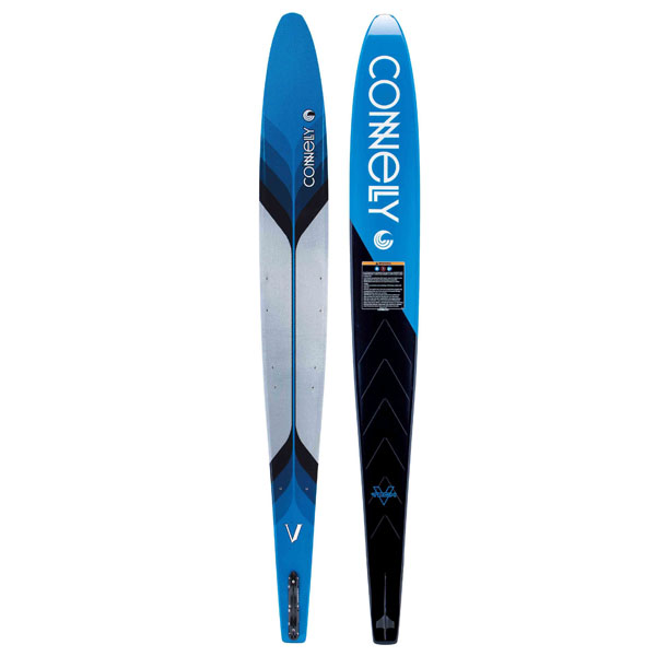 Ski de Slalom de carbono Connelly V. Nivel Avanzado. Mismo diseño híbrido del Carbon V, con el novedoso sistema de V’s escalonadas a lo largo del fondo que genera menos drag pero en este caso sin carbono. Medidas 65″, 67″ o 69″. Armado con doble bota o bota y estribo.