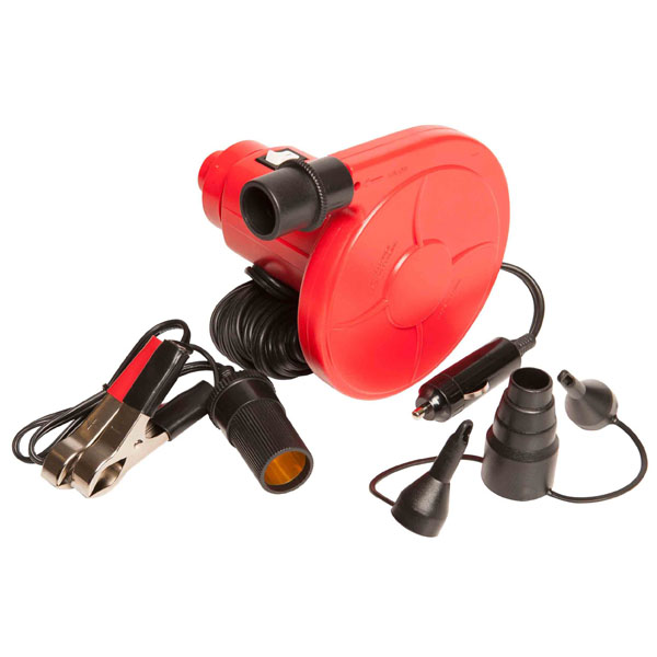 Inflador eléctrico HO Sports de 12V para inflables de arrastre. Infla o desinfla rápidamente. Adaptadores para válvulas Boston o Stem. Enchufe para encendedor o pinzas cocodrilo para batería.