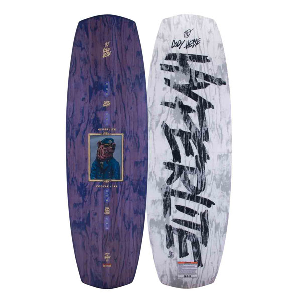 Tabla de Wakeboard Park Hyperlite Codyak. Nivel Avanzado/Profesional (amigable para principiantes e intermedios). Grado de FLEX: 4. Cody Hesse Signature Cable Wakeboard. La Codyak es una tabla con rocker continuo abrupto. Cody la describe como una tabla de diseño simple, facil de andar para cualquiera, como un diseño standard, angosto y lo más delgada que puede ser. Muy flexible en las puntas que tienen el fondo plano. Alma 100% de madera Woodlite. Rocker Continuo Agresivo. Cantos variables, redondeados y biselados en el centro y más delgados o “filosos” en las puntas . Centro con más fibra que regula la flexión entre botas pero menos en las puntas para que ahí flexione mucho más. Fondo reforzado “Sintered base”. Fondo de puntas plano. Medidas 143 o 147cm
