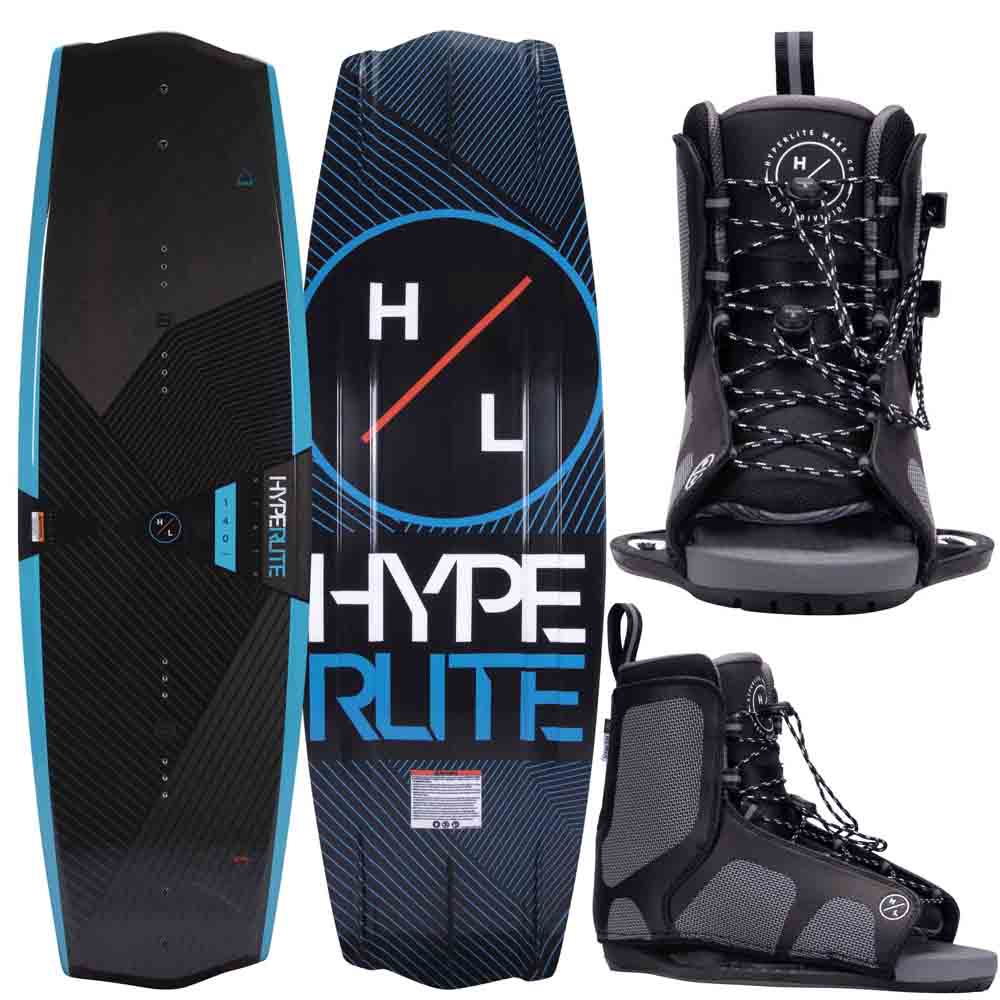 Equipo de wakeboard Hyperlite para niños. Tabla State 2.0 de diseño asimétrico con ayuda para el Toe-Side. Nivel Intermedio/Avanzado. Medida 125cm hasta 40kg. Botas abiertas Remix Kids nivel Intermedio talles K12/2.